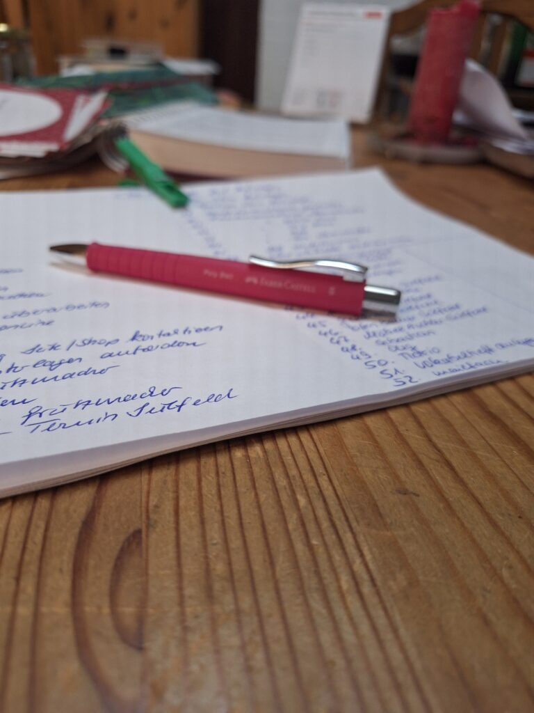 Dazu ziehe ich die Liste vom vierten Quartal 2025 und meine „erstmal aus dem Kopf raus-Liste“, die sich jede Woche verändert.